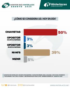 El estudio de Monitor País del mes de agosto revela que 50% de los venezolanos se autodefine como Chavista y apoya al presidente de la República, Nicolás Maduro. El 3% indicó que apoya a los partidos de oposición y 39% que no apoya a ningún partido.