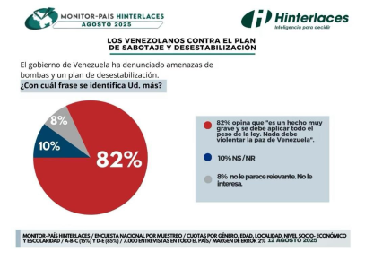 El estudio de Monitor País del mes de agosto revela que 82% de los venezolanos rechaza los actos de sabotaje y desestabilización por parte de potencias extranjeras en el país.