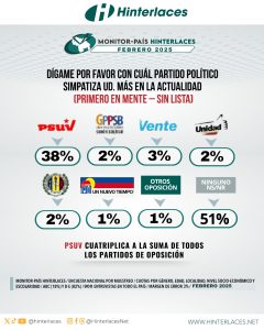 El estudio de Hinterlaces del mes de febrero determinó que el gobernante PSUV cuatriplica a todos los partidos de oposición. El 38 % de la opinión pública afirmó tener preferencia con el partido de la tolda roja.